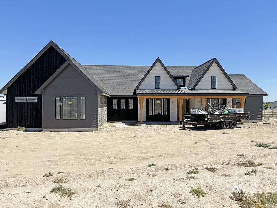Experience the charm of a modern country estate in Nampa's sought-after Lone Star Ranch subdivision. Nestled in a serene rural setting near Lake Lowell and Sunnyslope Wine Country, The Sawtooth by Cotner Building Company presents an exceptional single-level design on 1.06 acre lot. This home showcases a spacious master suite, two additional ensuites, and a sophisticated glass-enclosed study/den adorned w/custom built-ins. The spacious layout features a gourmet kitchen complete with top-of-the-line appliances, ample cabinetry, and impressive architectural touches throughout. The great room includes a Venetian plaster fireplace surrounded by birch log seating, complemented by vaulted ceilings and wooden beam accents. Chic wet room nestled w/in the Owner's Suite, boasts sleek floor-to-ceiling tiles in soothing neutral tones, enclosed in frameless glass, complete with multiple shower heads and freestanding tub bathed in natural light. Don't miss the 50' RV bay and 3-car side load garage (1808 SF Garage).