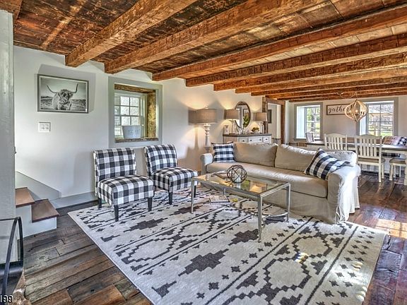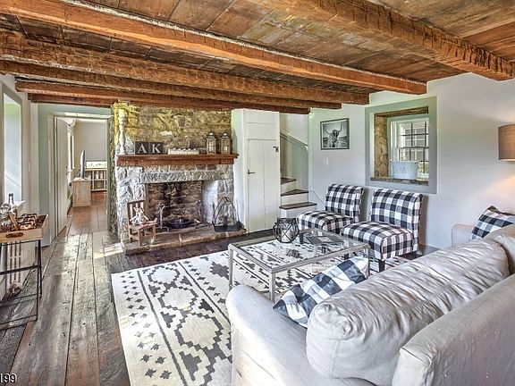 Historic Countryside Retreat on 20 Farm-Assessed Acres Constructed by one of Long Valley's earliest settlers, this impressively restored circa 1750 stone manor is one of the area's rare Neighbours houses. Sited within the German Valley Historic District, the home is surrounded by 20 farm-assessed acres with direct access to the Columbia Trail. Artfully renovated, the three-bedroom, two-and-one-half-bath floor plan is filled with natural light and original detailing. A substantial three-story red bank barn on the property can be used for entertaining, farm animals or vehicle storage. Scenic acreage includes an in-ground pool, open fields, woodlands, native plantings, meandering stone walls and post and rail fencing. Early American design elements merge effortlessly with 21st-century updates, resulting in a truly unique homestead. Exposed ceiling beams, wide plank wood floors, deep-set windows, Jersey winder stairs and three fieldstone fireplaces are among the vintage appointments, while the stylish baths and gourmet kitchen are up-to-the-minute amenities. A charming small bridge spanning the South Branch of the Raritan River leads to a long drive accessing this sheltered home. In the original wing of this expanded residence, a living and dining room combination is set under hand-hewn ceiling beams and warmed by the glow of an original stone fireplace. A modern family room is anchored by the dramatic floor-to-ceiling stone fireplace. Graceful features in the spacious kitchen include a furniture-grade center island, custom cabinetry, stone countertops, stainless steel appliances and glass doors to a stone-walled terrace. The cathedral ceiling primary suite connects to a dressing room, spa-inspired bath and private sun deck overlooking the refreshing pool. Two more bright and airy bedrooms share another full, updated bath. This historic home is ideal as a weekend getaway or premier year-round residence. Long Valley is a historic corner of Washington Township in western Morris County located about an hour from Newark Liberty International Airport. Small-town living appeals to residents and visitors alike who appreciate the natural beauty of the area for fly fishing, hiking and biking. Long Valley offers eclectic shops, inviting cafés, restaurants and an award-winning local brewery in the center of town.