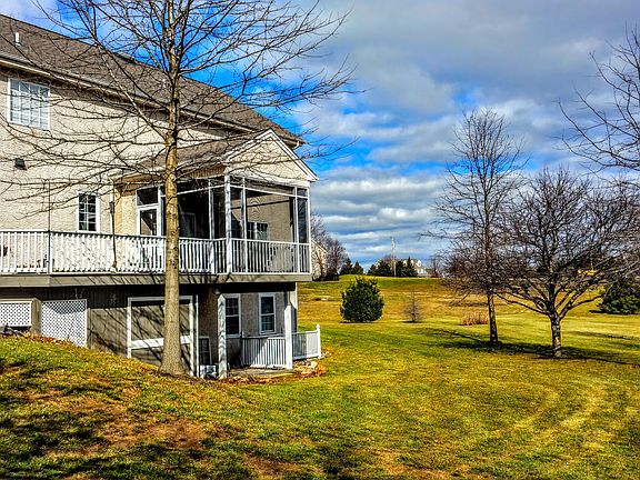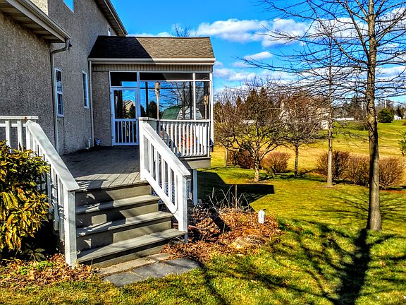 Beautiful stone and stucco 2 story single "farmhouse style" colonial, 4 bedrooms 2.5 baths, 2 story foyer entry, formal living room and dining room with hardwood floors, 9 foot ceilings, 42' cherry cabinets with quartz counter tops, breakfast nook, convenient first floor laundry room, great rm/family rm with gas fireplace and large triple window, screened in porch and large deck over look a picturesque view and a pond, huge master bedroom with walk in closet, master bath with a garden tub, stall shower and double vanity, full finished basement, walk out patio, central air, 2.5 car garage with workshop, custom 12 x 20 Amish built shed, 1.3 acres of beautiful landscaped lot with absolute gorgeous hillside views. Truly an exceptional property, even the most discerning buyer will find it meticulously cared for and know this is Home Sweet Home!