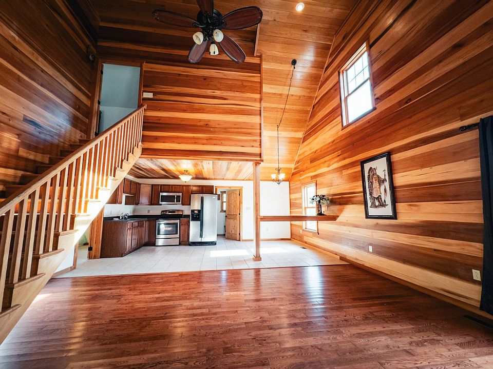 Tack roomModern comfortsGorgeous viewsWhite oak ceilingWhite oak breakfast barStunning oak hardwood floorsRustic elegance