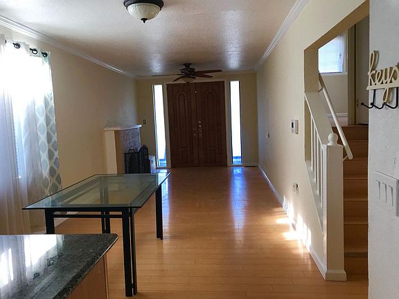 Cozy 3 bedroom, 2 bath HOME with lots of modern finishes. Open floor plan with living room with decorative fireplace and ceiling fan, dining area and galley kitchen with granite counters, tile back splash, stove, microwave with hood, and refrigerator. Laminate floors through out. Tiles in both bathrooms. Huge backyard with a lot of fruit trees. Off street parking. Garbage included.
