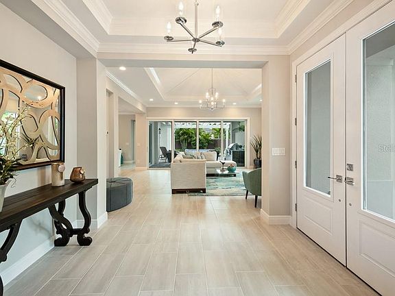 The Coquina by Heritage Builders is ideally situated in West Bay, a private gated enclave of only 4 luxury single family residences in Sarasota's most sought after West of Trail area. Don't miss out on this incredible opportunity, this is the last remaining home in West Bay. Thoughtfully designed, this Coastal inspired custom home presents a rare combination of quality and elegance set in a superior location. Guests are welcomed into a spacious foyer and great room with a wide vista of the sparkling pool and tropical landscaping through the 16' wide sliding glass doors. The Owners' Suite features a formal entry vestibule, dual walk-in closets, tray ceiling, spacious bathroom with split his and her vanities, walk-in shower and a free standing slipper style tub. The home's southern exposure provides ample light and warmth to the breathtaking pool area, lanai and outdoor kitchen. Constructed with attention to detail, the Coquina offers a custom kitchen with handcrafted hardwood cabinetry, stainless steel appliances, granite and quartz counter tops throughout, 8' interior doors, porcelain tile flooring, plush carpet, energy efficient spray foam insulation and hurricane impact resistant windows.