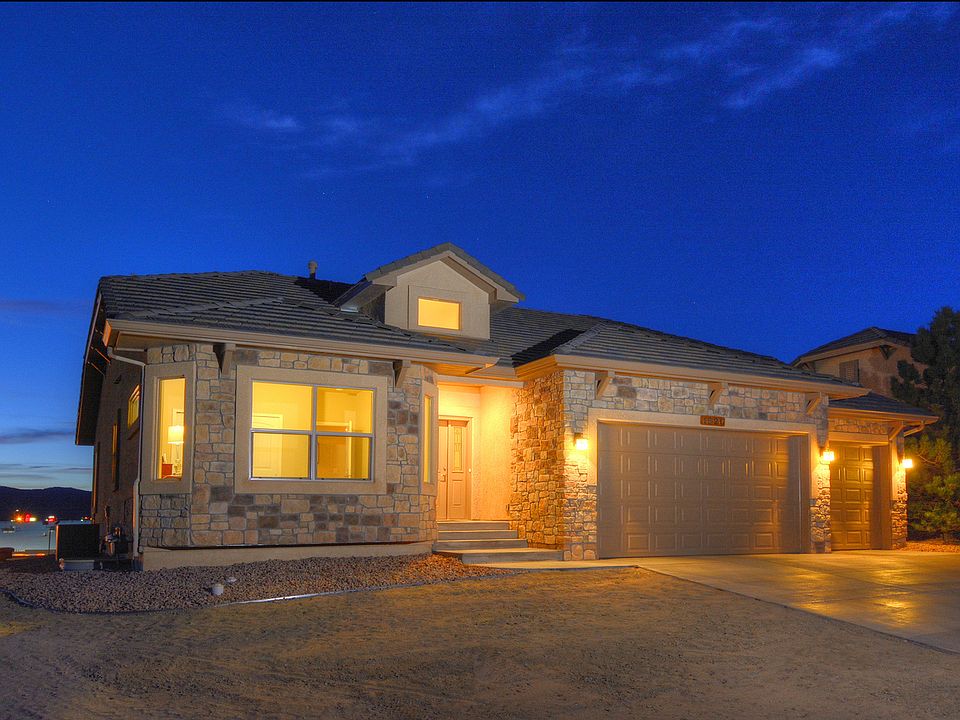Brand new, beautiful stucco & stone ranch home with views of the front range in a gated and maintenance free community. This wonderful home features main level living with large master bedroom and master bath retreat, a guest bedroom and bath, and laundry all on the main floor. Wonderful great room with fireplace flows into the large kitchen that features stainless steel appliances, granite counter tops and beautiful tile back splash. A covered deck, with access from the eating area and master, allows wonderful views of the front range. Downstairs in the finished basement is a huge in-law suite with attached bathroom in addition to a 4th bedroom and bathroom. There is a large rec-room for enjoying family time. Many beautiful upgrades - granite in kitchen and master bath, wrought iron spindles, birch cabinetry and more!! Don't miss this opportunity to live in this beautiful gated community conveniently located near 2 golf courses, shopping, restaurants, I-25 and schools. Maintenance free living at its finest! (Front yard landscaping to be installed when weather permits)