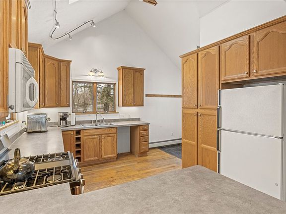 The open-concept kitchen boasts vaulted ceilings and stainless steel appliances, creating an inviting space for cooking and gathering. A unique two-sided fireplace connects the dining area and porch to the cozy living room, offering warmth and character. The first floor also includes a convenient laundry room and half bath.