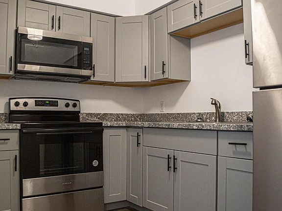 Completely updated interior with a fresh and modern gray and white color scheme. Brand new grey cabinets throughout the kitchen with a backsplash for a clean and contemporary look.