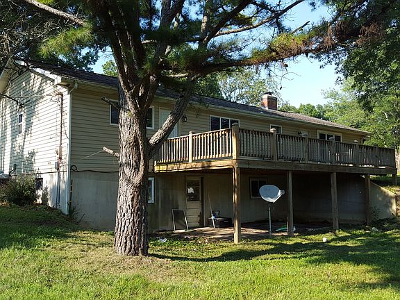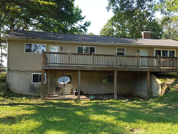 4 bedroom, 3 bathroom ranch with 2 car attached garage and full finished walkout basement. Property has 6.3 acres. Master bedroom has attached bathroom and glass patio door (with built in blinds) to walk out on the 14x34 deck. Roof, siding, and windows were updated in 2013. Basement has 1 large bedroom with built in bookshelves, another enclosed room that can be used as an office. Home has a living room, family room, dining room, kitchen, 3 bedrooms, and 2 baths on the main level. The main living room has a wood-burning fireplace with brick (floor to ceiling) and mantle, has a triple window overlooking rear of the property, and has an identical glass patio door (with built- in blinds) that exits onto the rear deck. The dining room and family room has faux laminate flooring. All 3 bathrooms have been renovated with ceramic tile, new shower enclosures, and vanities. Property has a live spring that runs through the property.
