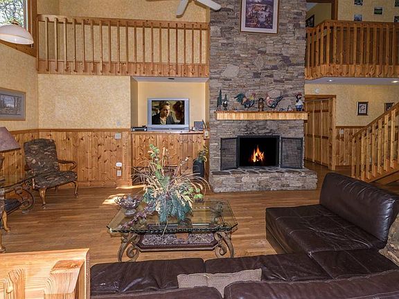 Large 4 bedroom, 5.5 bath cabin with 3 bonus rooms currently used used for entertainment (theater room, pool table, air hockey). Setup to sleep 14 people on overnight rental! In a private setting with wooded views. Features include a screened in porch, gas log fireplace in living room, hot tub, hardwood floors and cathedral ceilings. This home has had several recent upgrades which include a new metal roof, new high efficiency a/c units, a new higher efficiency hot water heater, new storage tanks for water, new well pump, new carpet, and some new furnishings. This home is well established on overnight rental, but would also make a nice permanent residence home. Comes fully furnished and decorated. Offered at an excellent price!