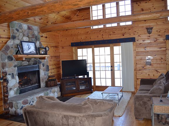 POTTERY BARN CHARM MEETS RUSTIC ELEGANCE in this Eau Pleine Flowage log home with full covered front porch that welcomes you into its grand foyer showcasing a spacious bright and sunny great room with vaulted ceiling, floor to ceiling stone fireplace, hickory floors and a full wall of windows! Dramatic open staircase with upper level loft area is perfect for an office or cozy reading spot just adjacent to the spacious master suite featuring private bath, walk-in closet and balcony. Warm and inviting kitchen boasts beautiful hickory cabinets, stainless appliances, snack bar and large dining area with French door access to the wrap around deck overlooking gorgeous water views makes it great for entertaining! Newly decorated, the two bedrooms, full guest bath and laundry room complete the main floor living space. Lower level family room has brand new cushy carpeting, sauna for those cold winter nights and bonus room with mirrored wall perfect for an exercise room or dance studio and full bath with shower. Situated on just under an acre lot with custom fire pit and newly landscaped with perennials, hydrangeas and peonies, this beautiful log home exudes pride of ownership! With private access to Eau Pleine Flowage boat landing with pier, beach and park just down the road, the 3 car garage is perfect for storing all those water toys!