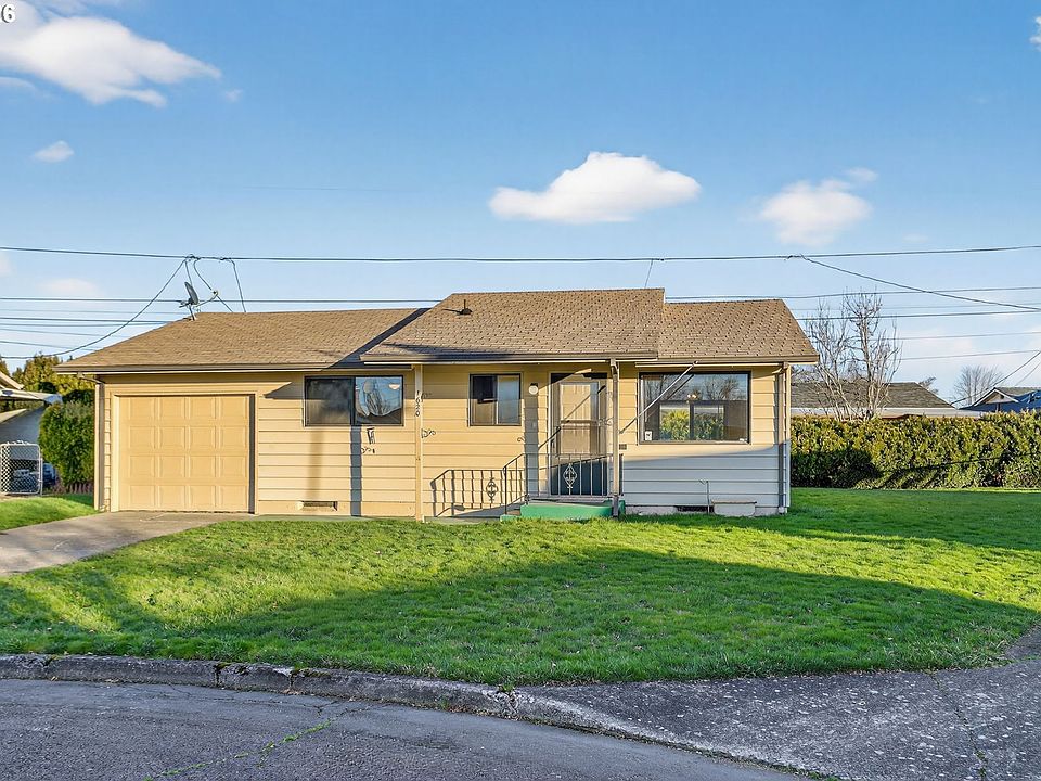 Cute one level on a quiet culdesac.Fresh interior paint graces this two bedroom, 1 bath, with a one car oversized garage. Hardwood floors give the interior a warm, and inviting feel. Living room / Dining room are open for you to decorate to match your lifestyle. Refrigerator, Washer, and Dryer are included. One car garage has lots of storage and a door that exits to the back yard for gardening. The back yard that is partially fenced has a lovely covered patio, for enjoying morning coffee. Due to the culdesac, this home enjoys what feels like a larger pie-shaped yard.Enjoy the many luxuries of the Community in this Woodburn Estates and Golf which is 55+. Luxuries include the heated indoor pool, hot tub, billiards, library, gym, auditorium, and of course the wonderfully kept golf course.