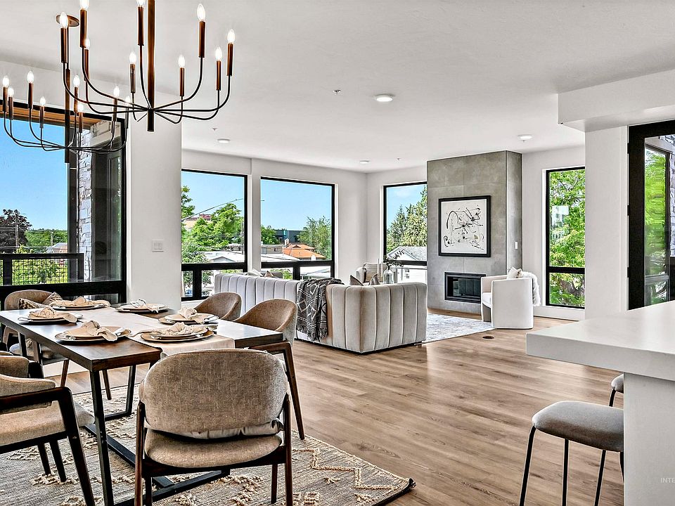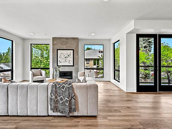 This beautifully designed North Boise Mid-Rise is a spectacular representation of modern condo living. Foothill & city views from every room with today's urban dwellers in mind. The Travis is a unique opportunity! The exceptional 3 bed, 2 1/2 bath unit showcases quality at every turn. The welcoming entry draws you into the spacious & wide-open great room where you are enveloped by natural light and tremendous views ~ all of which just pour in from the custom oversized Marvin windows. The chef's kitchen is enriched w/espresso shaker cabinets, a 36” Cafe gas range, & Silestone Quartz Suede countertops. The large living room has floor to ceiling tile surround gas fireplace & there's room for 10+ guests to dine with access to both private patios. LVP flooring in the main living areas & baths and luxurious amenities throughout are sure to spoil you. Interior laundry makes your least favorite chore so much easier! Building amenities include bike storage, an assigned garage parking space & gym! This one is THE ONE!