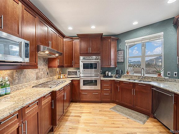 Nestled in the scenic backdrop of Golden, this custom home offers expansive views of North Table Mountain and the surrounding foothills. Enjoy the Colorado lifestyle with direct access to Fairmount Park and walking paths right from your backyard. The wrap-around deck is perfect for dining, entertaining, or simply relaxing while taking in the stunning vistas. The open floor plan features real wood floors, vaulted ceilings, and a great room with a gas fireplace framed by built-in cabinets. The kitchen is a chef’s delight with stainless steel appliances, including a gas cooktop and double oven, granite countertops, a breakfast bar, and more spectacular mountain views. A private office, a half bath, and a convenient laundry area complete the main floor. Upstairs, you’ll find the primary suite with an ensuite 5-piece bath and two large closet spaces. Two additional bedrooms connected by a Jack-and-Jill bath and a second laundry will ensure space and convenience. The basement is also sure to keep guests or families entertained with another living area, billiards room, and another private bedroom with a full bath. The ranch style in-law apartment is ideal for multi-generational living or rental income, featuring its own private entrance with a custom kitchen and open floor plan living area including two bedrooms, a 3/4 bath, and walk-in closet for extra storage. Practical amenities include RV parking with an electric hookup and dump station, a spacious lot with a workshop, and no HOA. Located close to downtown Golden, this property is a blend of comfort, convenience, and breathtaking views, ready for your next chapter. WELCOME HOME!