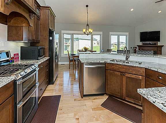This ranch home features a split floor plan with 4 beds and 3 baths in over 3200 sq ft. Main level features an open family room and eat-in kitchen with a wood surround fireplace and vaulted ceilings. Kitchen has a large center island with room for seating, granite counters, mocha wood cabinetry, and SS appliances. Off of the kitchen is the covered deck that provides access to the spacious, flat and usable backyard. Main level also has the master suite, 2 large bedrooms, a full bath and laundry room. Master suite features Coffered Ceilings, dual vanities with granite, a soaker tub, a walk-in tile shower and a large master closet with custom shelving. The LL has a huge family/game room space with another full bedroom and 3 quarter bath. The heated garage features epoxy floors and extra cabinets for storage. This home is move-in ready, near bike trails and is within walking distance to Schuller Elementary.