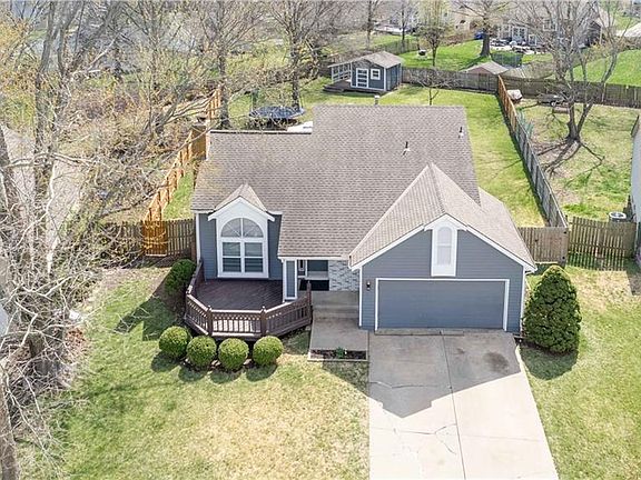 Prepare to be wowed by this Devonshire beauty. Step inside to find a charming design, bright / open floorplan, and a modern flair. Dramatic vaulted ceilings and hardwood floors throughout the main level. Painted brick fireplace. High traffic stair carpet. Fresh and updated kitchen with granite counters, glass tile backsplash, stainless appliances, gas stove and fridge staying! The master suite boasts vaulted ceilings, double doors, hanging pendant lights, and a walk-in closet, while the updated bathroom provide a touch of luxury. Second bedroom on the upper level, with the third bedroom located in the daylight level with another updated full bath. This home has been updated with new HVAC, windows, carpet, paint, fixtures, and much more! Outside enjoy a super-sized level lot, perfect for entertaining and grilling, complete with a gazebo and trampoline that stay with the home. A large storage shed provides even more space for your outdoor gear. Walking/bike trails, school, and public park all within the neighborhood! You will not beat central Olathe location: easy highway accessibility and literally hundreds of top tier shopping/dining/entertainment options all around you.
