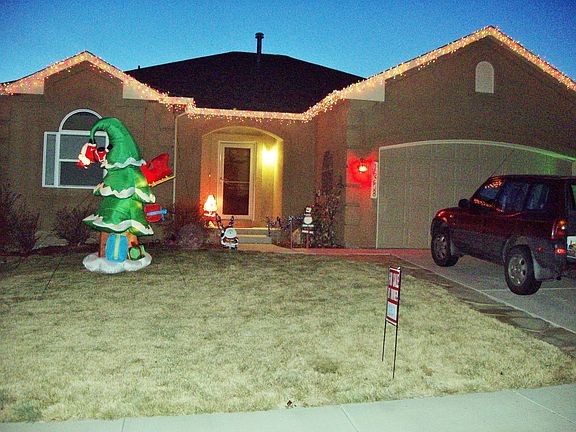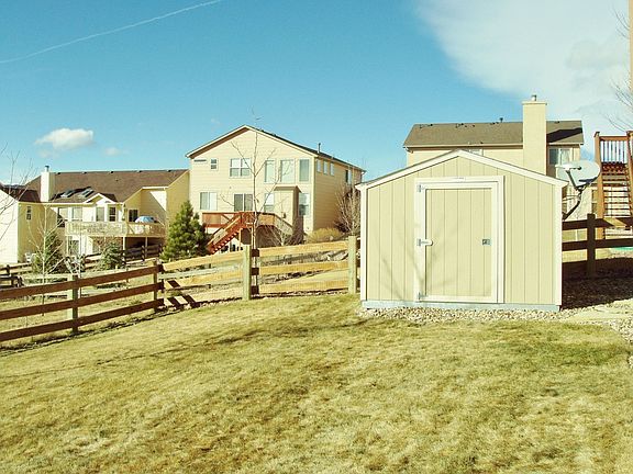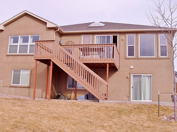 Located in beautiful neighborhood and has Large kitchen with a breakfast bar pantry and tile counter tops Separate dining area has amazing views and walk out to Trex Deck Immaculate city mountain and Pikes Peak view Master bedroom has carpet ceiling fan and french doors leading into a five piece master bath Basement includes very large family room with a walk out to a fully landscaped fenced backyard This home comes with a security system sprinkler system storage shed and is in a great location Easy access to I25 and restaurants A Must See