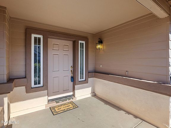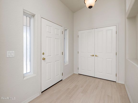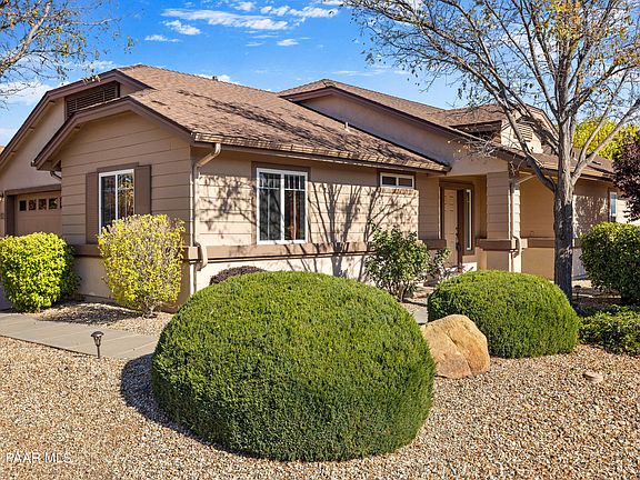 Located in gated golf community, this 1-story is situated on corner lot in quiet cul de sac. Entering foyer, living area, formal dining & attractive partitioned office space with built in desk open up for great entertaining. Flooring redone with beige/taupe tile throughout except bedrooms. Completely remodeled kitchen tastefully finished with stainless steel appl & quartz countertops, cherry finish on cabinets and plenty of storage. Wine refrig conveys with house. Smart lower lip of island gives convenient dining space when on the go. Family room located next to kitchen has gas fireplace. Some light fixtures replaced. Primary offers en suite with large walk-in closet. Views of Granite Dells & Mingus enjoyed in backyard with covered patio & artificial turf, perfect for pets or outdoor use.