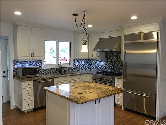 Traditional Country Charmer with 3 Bedrooms, 3 baths (3 suites). Kitchen has upgraded appliances, stained glass windows and access window opening to dining room. Dining room has false beamed ceiling with custom stained glass bay window. Brick flooring in entry, kitchen, dining and family rooms. Living room is open to family room with skylight and inviting brick fireplace. Family room has cedar beamed ceilings and walls with widows and doors that open out to gorgeous entertainer's backyard with saltwater pool and spa. Master bedroom has french doors that open out to backyard. Master bath remodeled with tumbled marble. Guest bath has clawfoot tub and antique sink. Many fine custom crafted features including sugar pine interior doors and linen cupboard and crown molding finishes. Front yard beautifully landscaped with white picket fence, flowers, grass, system pavers driveway, and extra carport great for boat parking, plus a cozy front porch with brick.