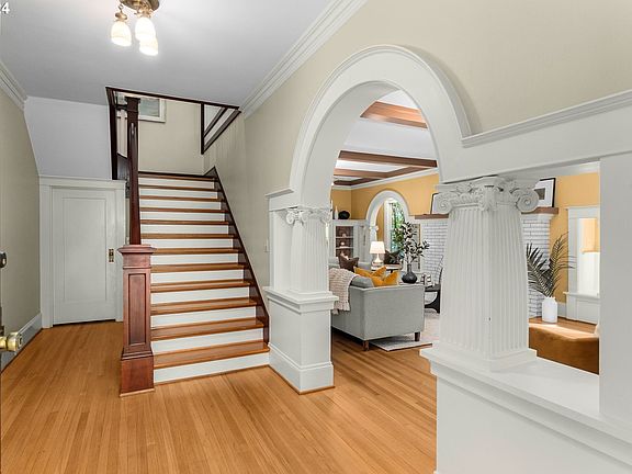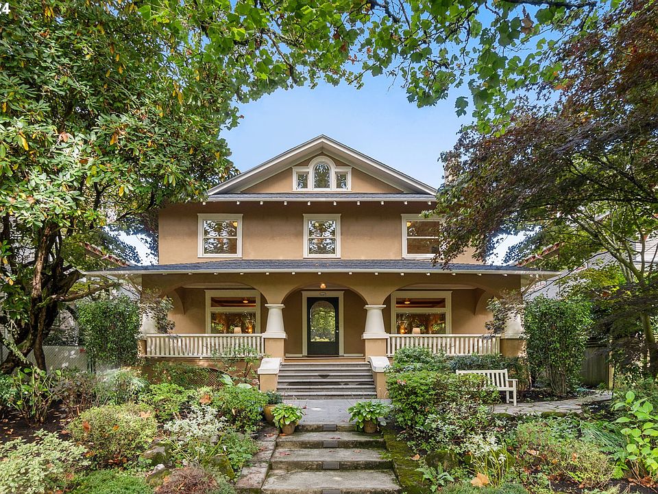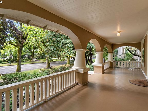 This stunning 1910 craftsman, designed by renowned architect Archie Rice, is located in the heart of Irvington. Known as "the home with the arches," this property showcases its signature architectural details throughout, including arches and columns in the front dormer, foyer, window seats, and a beautiful glazed white tile fireplace in the living room. The home’s stately, full-width covered porch offers a grand entrance, perfect for relaxing or entertaining. Inside, the home boasts architectural features including high box beam ceilings, extensive woodwork, and wainscotting. The spacious living room features a gas fireplace with glazed white tile, built-in bookcases and window seats. French doors open to a sunroom, offering a versatile space that can be used as a den or additional bedroom. A rare full bath on the main level provides added convenience. The updated kitchen features granite counters, a new range, and a built-in hutch. Upstairs, there are four bedrooms with walk-in closets, a full bath and access to private balcony. The third-level primary suite offers a peaceful retreat with an ensuite, fireplace, and custom skylight. Additional highlights include a large lower level with large family room, laundry and storage; out back, a private courtyard garden with fountain. An extraordinary home, combining historical significance with modern comfort. [Home Energy Score = 1. HES Report at https://rpt.greenbuildingregistry.com/hes/OR10233599]