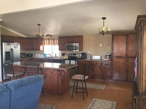 Beautifully remodeled manufactured home on a quarter acre. This 3 bedroom 2 bath home has a huge living room-kitchen area with xtra large island, granite counter tops, new custom cabinets, stainless steel appliances, bamboo flooring, vaulted ceilings (no popcorn), new dual pane windows, bull nose corner walls and crown molding. The property is completely fenced, it has a brand new 24 x 60 RV/carport, 10 feet high, cinder block foundation and a 15X15 shed in back. Just Minutes from shopping and the base. Must See!!
