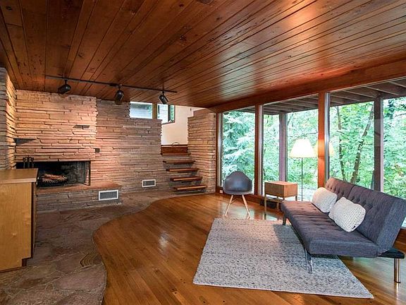 This authentic, untouched mid-century modern home is nestled in a secluded, wooded setting on the north side. Floor-to-ceiling windows seamlessly connect the interior with the natural surroundings. The main level features an open layout, showcasing the original limestone fireplace, pegged hardwood floors, natural stone flooring, and a cantilevered staircase leading to a bedroom loft. The bedroom offers views of towering evergreens through limestone-clad walls and windows. A second bedroom, currently used as a study, offers glimpses of hawks and eagles, while the hallway and third bedroom, with clerestory windows, frame picturesque views of nature. A true embodiment of the classic Usonian design. New Lennox HVAC in 2024! Photos are from 2017. Some minor changes have been made since the photos.