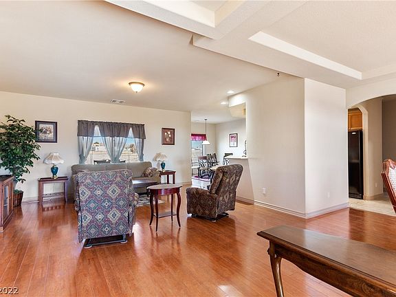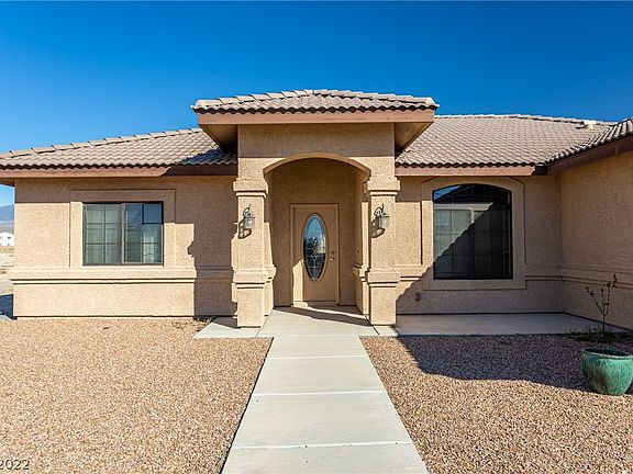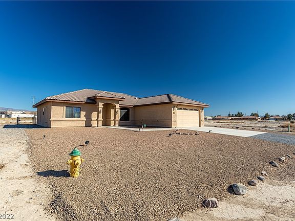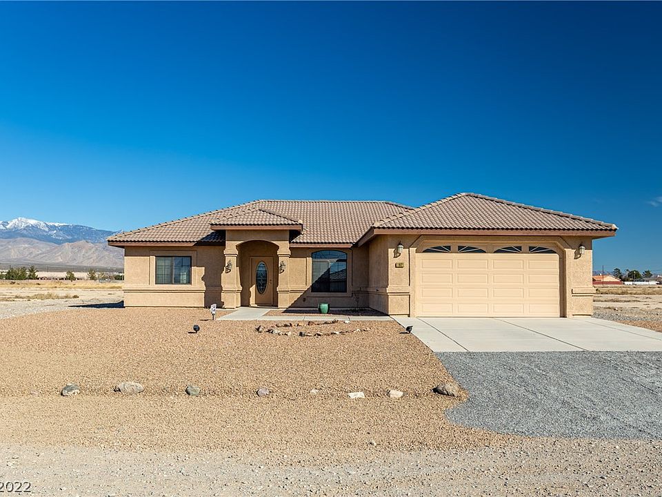 True pride of ownership here! This gorgeous 1896 square foot home boasts spectacular mountain views! Built in 2008, this 3 bedroom home includes a breakfast bar, breakfast nook and formal dining area. The large primary bedroom has its own bath with a walk in shower and separate tub. This yard is perfectly cozy, and low maintenance. Sit out on the back patio, enjoy your morning coffee and amazing view of Mt. Charleston. No neighbors on either side. Solar is owned, and there is NO HOA. Come take a look at this home, in a rural town outside of the big city. You won't regret it!