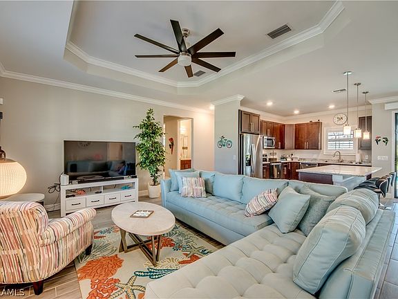 This beautiful Gulf Access Home home was built in 2020 and offers 4 bedrooms, 3 bathrooms and an open living concept on 2100 SFT. Sliding glass doors open to a paved pool deck with heated saltwater pool and covered lanai. The interior of the home features a spacious living area with tray ceilings, an elegant kitchen with upgraded wood cabinets, stainless steel appliances and granite counter tops. More upgrades include crown molding, coffered ceilings, porcelain tile throughout, pool bath, plantation shutters, window treatments for sliding doors in living room and master bedroom, extra cabinetry and stainless steel sink in laundry, epoxy floor in garage, extra wide driveway, and many more. This home is being offered furnished with some exclusions.