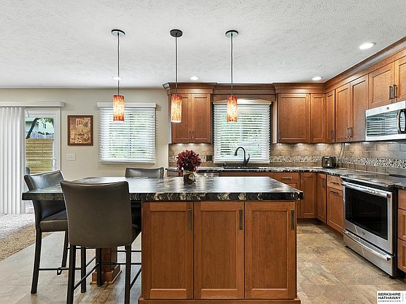 Stunning Two Story on Cul-de-sac in Prairie Pointe! Home is close to trails & Lake Zorinsky. Completely updated kitchen has custom (soft close) cherry cabinets, pots & pans drawer, lazy susan, trash pullout, leathered granite counters, tile backsplash, large island (heated) + pendant lights, pantry & small appliance storage & black + stainless appli. Living rm has fireplace w/brick surround. Formal dining rm & formal living rm located on main. Half bath has wood flr & quartz counter w/vessel bowl. Laundry is conveniently located on main flr. Primary bdrm is large & has remodeled bath w/tile flr, custom shower & quartz counters. Two additional bdrms are of good size & bdrm 2 w/walk-in closet. Main bath has been updated. Finished lower level has rec rm, flex rm & storage area. Humidifier, water softener, & whole house filtration system. Heated garage has dedicated sub-panel. Large, fenced bkyd w/mature landscaping, XL patio w/privacy screen & shed. Roof (2019) & exterior paint (2024).