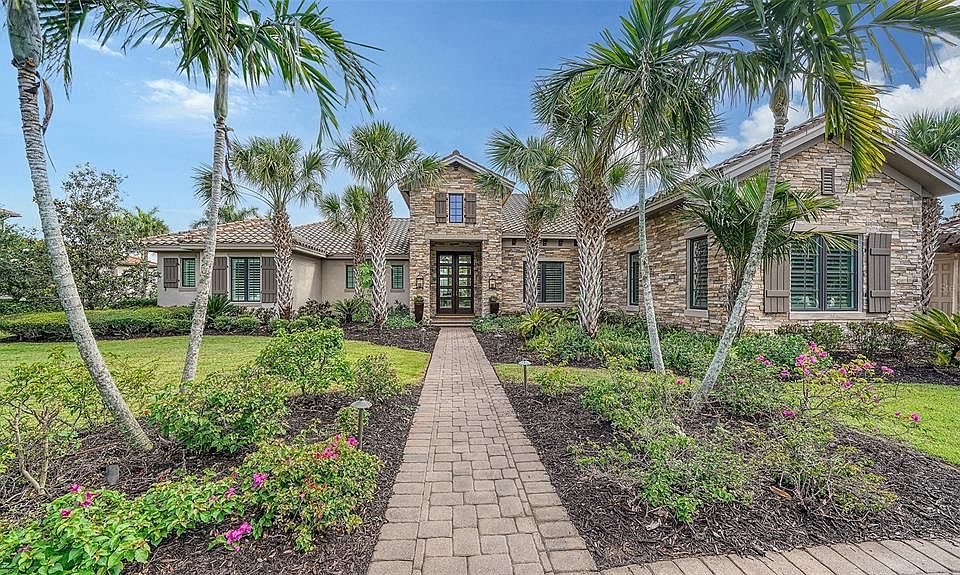 New price, now listed without the designer furniture package and with several home improvements made. A former Anchor Builders premier neighborhood model home, this exquisite residence will immediately make you envision your elevated life of luxury. The Lake Club is the most exclusive village in Lakewood Ranch, the nation's best selling all-ages master planned community. Peace and privacy abound, with a gorgeously landscaped linear park out the front door and a serene 160' lakefront setting in the backyard. At 5,249 square feet of living space, plus another 2,125 of covered outdoor space, the resort style pool, and the nearly 1-acre yard, this single-story home has all the room you need to live in comfort. This one of a kind residence was originally designed and furnished by Marc-Michaels Interior Design, a nationally renowned design firm. Roy Dupuis and his team at Anchor Builders gave every inch of this house exquisite attention to detail. You'll find 14' ceilings throughout the home, each with an architectural element such as crown molding, tongue and groove, or coffered design. The more you look around, the more you will fall in love with the details and beauty of this light and bright home. The kitchen is equipped with matching SubZero refrigerator and freezer that effortlessly blend into the ample cabinetry. Natural gas throughout fuels the Wolf oven and stove, grill, water heater, and two fireplaces. Guests will love gathering around the large kitchen island or mingling in the formal living room before sitting down at the oversized dining table. The screened outdoor patio is also the perfect place to gather, grill in the outdoor kitchen, or even just relax by the outdoor fireplace on your own with the gorgeous view of the lake. When you are ready for a swim, you will feel like you are on vacation with the pool perfectly nestled in the palm trees and with ample privacy from the neighbors. Each of the home's 4 bedrooms include an en-suite bathroom and walk in closet to make you and your loved ones feel right at home. A full pool bathroom and a powder room make the perfect options for guests. The master suite includes a sitting area flooded with natural light and room darkening Hunter Douglass remote-powered window treatments for those days you want to sleep in. Walk from the master bedroom into the bathroom past his and hers walk-in closets and you'll find the stand alone tub and split vanities with an extra counter space for the lady of the house to sit and do her makeup in the morning. Porto Cochere garage design gives you 3 spaces and complements the Tuscan inspired elevation. This custom estate home is located in the heart of The Lake Club, with the amazing all-new Grande Clubhouse just a quick walk or golf cart ride away. Its new modern interiors include an enhanced lobby with new beverage bar, beautiful new furnishings in the concierge area and billiard room, spa, advanced audio/video technology in the board room, and an expanded fitness area. In addition to the regal 20,000 square foot Grande Clubhouse, the activity hub also has a tennis center and two pools for neighbors to enjoy. The Lake Club has programming to fit everyone's idea of fun- from card games and book clubs, to Easter Egg hunts and holiday brunches, you will find it all to share with your wonderful neighbors in this much sought after community. Book your private tour of this luxurious home today and come live The Lake Club lifestyle!