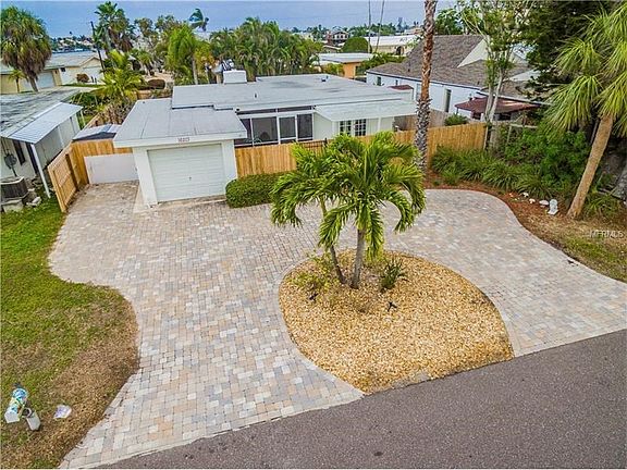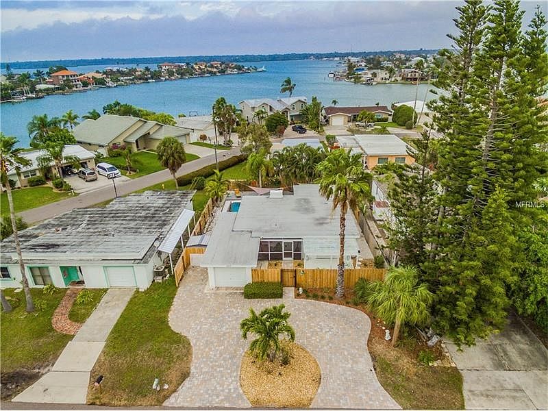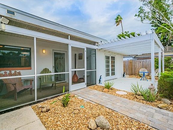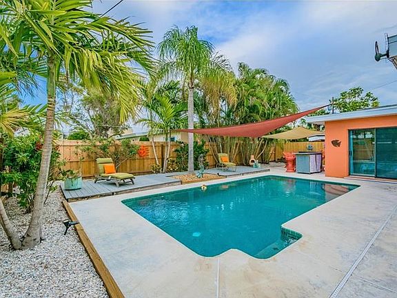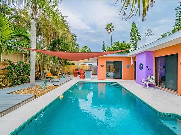 Mid-century modern meets rustic-chic beach cottage ! Perfect 2BR/2BA pool home in Redington Beach offers ultimate privacy and comfort just a short walk from the best of the gulf beaches. This beautifully maintained home boasts gleaming terrazzo floors throughout, exposed beam ceilings, galley kitchen with concrete countertops and stainless appliances, an energy saving mini-split A/C System and a working wood-burning fireplace in the open living space. Once you step into the thoughtfully landscaped backyard featuring a sparkling Pebbletec pool, multiple entertaining spaces with landscape and flood lighting, hot/cold outdoor shower and included gas grill, you will never want to leave ! An attached one-car garage and circular drive allow for plenty of parking: a gated front courtyard offers extra privacy and security. The long list of upgrades and amenities make this home move-in ready; an included home warranty makes it worry-free