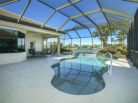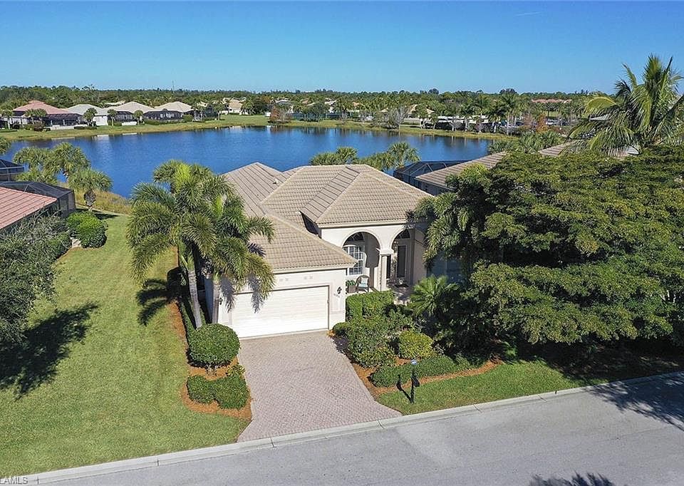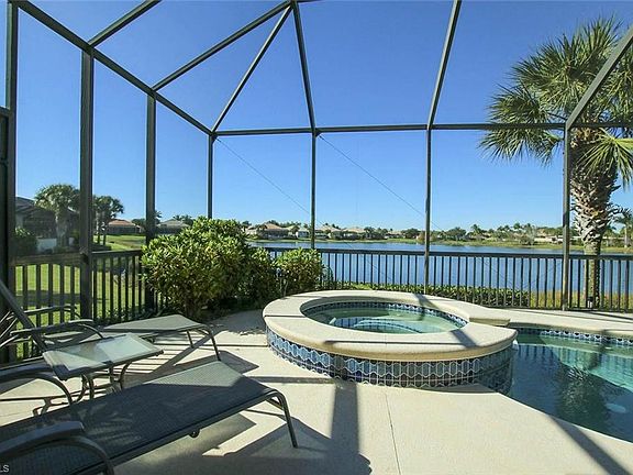 This 4 bedroom/ 3 bath home with pool and spa is located on quiet cul-de-sac street in Crown Colony and has a fantastic lakeview. Recent updates include: electric hurricane shutters on lanai and front door, BRAND NEW A/C system 2019, rescreened lanai with "no-see-um" screening, newer carpet in bedrooms and some new lighting. Decorated in coastal colors with plantation shutters, soaring ceilings, crown molding, and high baseboards. This "bump out" Sterling floor plan with living room, dining room and huge family room to maximize those views! The kitchen features a pantry, desk and island. This home's lovely furnishings could be purchased as well. The golf club in Crown Colony is optional and private, social memberships available too. A 24 hour guard gate, along with lawn care, internet, cable, community pool, spa, fitness center and tennis are covered by the low quarterly dues of $1219. Located near the beaches, shopping, dining and Health Park.