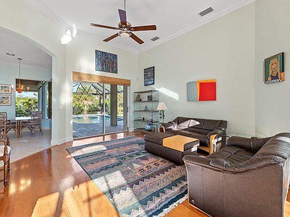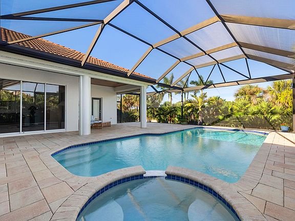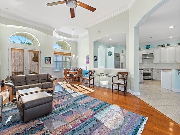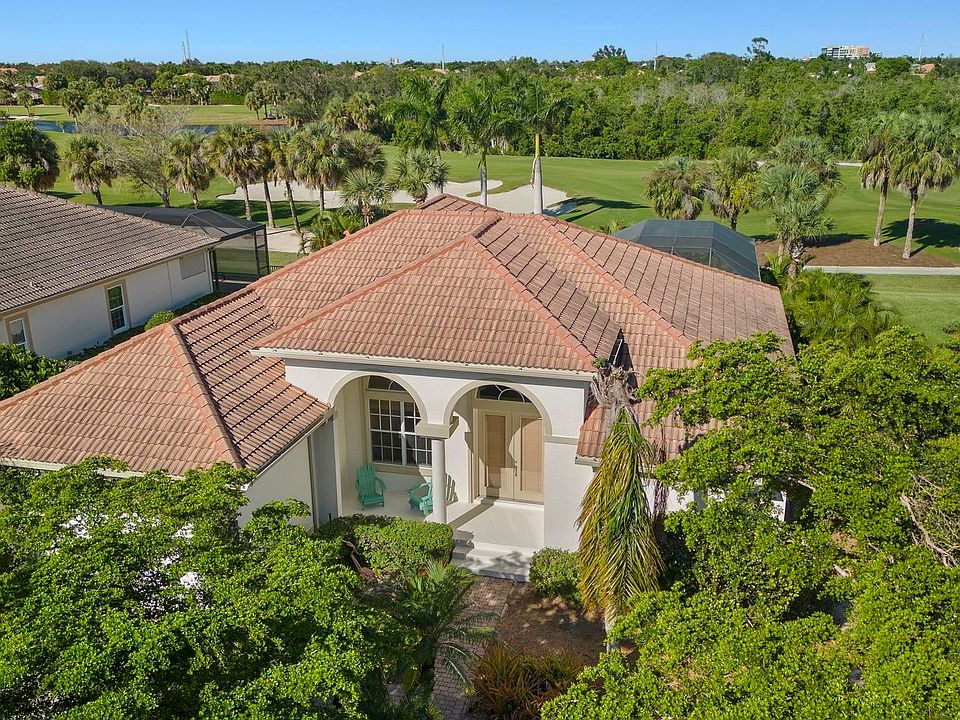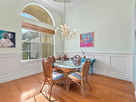 Welcome home! This magnificent Crown Colony residence offers a blend of elegance & modern living. The kitchen is a culinary masterpiece, boasting top-of-the-line SubZero refrigerator, Wolf gas range, & Bosch dishwasher appliances. Solid wood cabinets, including lower cabinets w/pullouts, a Brazilian Cherry butcher block island, Crema Marfil marble countertops, and onyx pendant lights create an inviting atmosphere. The home showcases high ceilings, beautiful hardwood & tile floors, complemented by New Zealand wool carpeting in the four generously sized bedrooms. All three bathrooms have been tastefully remodeled. Custom crown molding & wainscot add a touch of sophistication to every room. Step onto the lanai, where the pine ceiling and brick paver deck provide the perfect backdrop for relaxation. The heated pool & spa take center stage, offering year-round enjoyment. Outside, a custom tropical landscape creates a private oasis w/Western facing views of the golf course & serene preserve . Located in the prestigious gated golf community of Crown Colony, this home offers an exceptional living experience in an upscale, refined setting. Your dream home awaits!