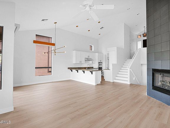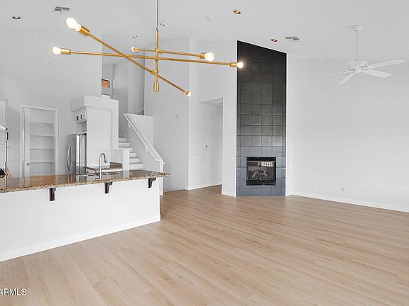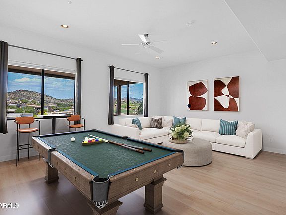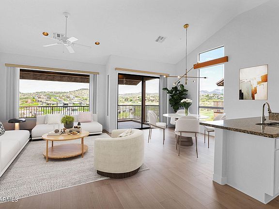 Luxurious Tri-Level Golf Villa in Prestigious Balera at Firerock. Experience resort-style living in this beautifully remodeled tri-level golf villa, nestled within the exclusive gated Balera community. Overlooking the 10th tee box fairway of Fire Rock Country Club, this home boasts breathtaking mountain views and an elegant, modern design. This spacious villa features 2 bedrooms, 3 bathrooms, and a versatile floor plan designed for comfort and style. The great room flows seamlessly into the gourmet kitchen, which is equipped with granite countertops, stainless steel appliances, a gas stove, and a walk-in pantry. The living room, complete with an electric fireplace, and the adjacent dining area open to a private patio with stunning views. The master suite is a true retreat, offering dual