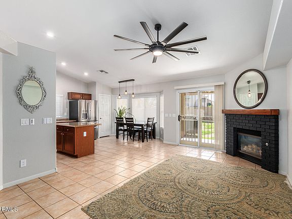 Welcome to this energy-efficient 3 bed, 2 bath home in Mountain Vista Ranch! Featuring an inviting living room, and a open-concept kitchen & family room w/fireplace for chilly nights. The eat-in kitchen boasts SS appliances, mosaic tile backsplash, a pantry, ample cabinetry, a bay window, and an island w/breakfast bar. Vaulted ceilings, tons of natural light, designer palette, and tasteful flooring - tile, carpet & luxury vinyl enhance the inviting vibe. Main bedroom offers a bay window & a walk-in closet! Ensuite features a barn door, dual sinks, & separate tub/shower. Low maintenance desert front yard and a 2-car garage w/attached cabinetry. Check out the large backyard with a covered patio, grassy area, & a storage shed! Leased solar system saves on energy costs. Don't miss this one!