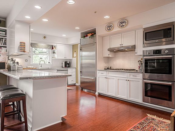 Updated Highlands area brick ranch. Living room has large picture window, gas fireplace, and connects to the formal dining room. The kitchen has been updated & includes Bosch double oven, Sub-Zero built-in refrigerator, Thermador 5 burner gas cooktop, and premium white cabinetry. Ample laundry room off the kitchen. Gathering/family room open to kitchen with wood burning fireplace and new sliding doors leading onto the deck overlooking the fenced rear yard. Master bedroom has a new ensuite bath with tile walk-in shower with glass surround. Refinished hardwood throughout, cork in the kitchen and gathering room, and tile in the foyer and baths, carpet in lower level. Walkout lower level entertaining space has a serving bar, 3 sided fireplace, half bath, and hot tub on the patio. 2 car garage.