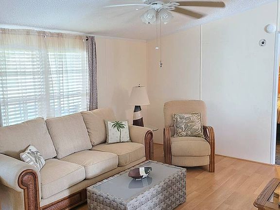 For More Information, Please go to the Virtual Tour Link. Located in Senior Park with Monthly Lot Rent of $666. NICE 2 BEDROOM, 2 BATHROOM HOME IS FURNISHED WITH SPLIT FLOOR PLAN! THERE IS A SCREEN PORCH ON THE FRONT OF THE HOME AND A PRIVATE SUNROOM OVERLOOKING THE BACK YARD! THE DEN CAN ALSO BE USED AS ANOTHER BEDROOM, OFFICE OR CRAFT ROOM. A DOUBLE DRIVEWAY PROVIDES AMPLE PARKING FOR GUESTS. HOME HAS INSIDE LAUNDRY, NEWER WATER HEATER AND IS MOVE IN READY! Located In Foxwood Village, Nestled In Gently Rolling Hills. Beautiful Foxwood Village Is A 55+ Park (80/20). 2 Pets Are Welcome Under 40 Pounds, Measuring 20" To Spine, with Breed Restrictions. Motorcycles And Rentals Are Allowed. Foxwood Is Located In North Lakeland Near The Lakeland Mall, Retail Shopping And Restaurants. **$58 Monthly Pass Through Tax. SCREEN PORCH 9.5 x 19.5 Great Place to Enjoy the Weather! Located off the Double Driveway on the Front of the Home. Furnished with 2 Chairs and 3 End Tables. Composite Flooring. LIVING ROOM 11 x 18 Spacious Room with Sofa, Recliner, Chair and Ottoman. Coffee Table, 2 End Tables, 2 Lamps and Flat Screen TV. Ceiling Fan with Light. Window Treatments and Laminate Floor. KITCHEN 11 x 20 Plenty of Cabinets in this Large Kitchen! Table and 4 Chairs. Kenmore Refrigerator with Ice Maker and Range with Vent Hood. GE Microwave. Pantry. Ceiling Fan with Light. Access Door to Sunroom. Window Treatments and Laminate Floor. SUNROOM 9.5 x 13 Perfect Spot to Relax! Located off the Kitchen with Sliding Glass Door to the Backyard. Loveseat, Chair, Coffee Table and 2 End Tables. Ceiling Fan with Light. Window Treatments and Indoor/Outdoor Carpet. MAIN BATHROOM 4.5 x 7.5 Single Sink Vanity with Walk In Shower. Ceramic Tile Floor. MASTER BEDROOM 11 x 11.5 Furnished with Queen Bed, Dresser, Chest of Drawers, Bedside Table and Lamp. 4 x 4.5 Walk In Closet. Ceiling Fan with Light. Window Treatments and Carpet. MASTER BATHROOM 4.5 x 11 Wide Single Sink Vanity with Walk In Shower. Ceramic Tile Floor. GUEST BEDROOM 9.5 x 11 Furnished with Double Bed, Dresser, 2 Bedside Tables and 2 Lamps. Built In Closet. Window Treatments and Carpet. DEN 8 x 9.5 Built In Closet. Ceiling Fan with Light. Window Treatments and Carpet. LAUNDRY Located in the Kitchen. Kenmore Washer and Hot Point Dryer. Storage Cabinets and Laminate Floor. STORAGE SHED 7.5 x 7.5 Located Behind the Home. Shelving for Storage. About the Park: Foxwood Village Offers A Full Calendar of Social Activities and Clubs for Residents. Amenities include a Large Social Hall with Kitchen, Heated Pool and Jacuzzi & Sauna! Laundry Facilities, Exchange Library, Secure Mailboxes, Fitness Room and Shuffleboard Courts. Outside Storage Area for RVs, Boats and Trailers (Subject to Availability) Close to Lakeland Square Mall & Cinemark Theatre with 18 Theatres, Entertainment, Restaurants, Churches, Doctors, Lakeland Hospital and Beautiful Downtown Lakeland located on Lake Mirror. Information stated in description of home and park is not guaranteed. Responsibility for obtaining current fees, rules & regulations associated with the community/park/home is the Buyer's responsibility. Home sold 'As Is' without warranties or guarantees by seller and/or Snowbird Living. Home and Room sizes are approximate and not guaranteed.