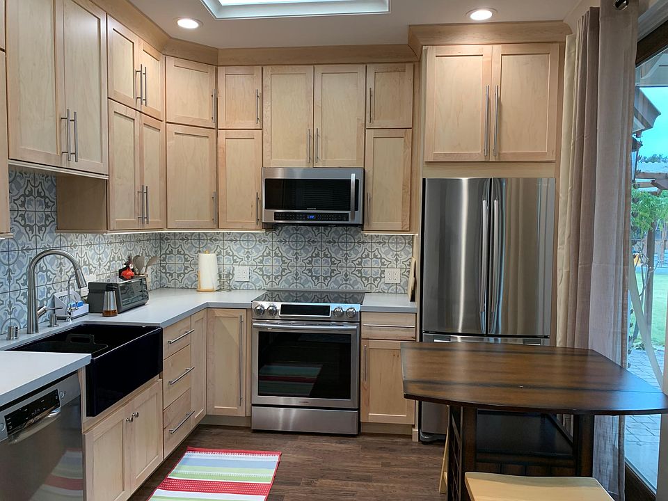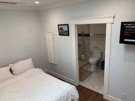 Stunningly designed and thoughtfully furnished in-law unit in a safe residential neighborhood amidst a thriving victory garden (Spring through fall). Newly Built in 2020. Green building certified Fully furnished ~500 sq ft In-Law Unit attached to a single family home. Separate address. Separate Entrance. With 9 foot ceilings the unit is bathed in natural light from large windows & skylights Features Top of the line kitchen, with custom built cabinets, farm sink, large pantry and all new stainless steel appliances(Refrigerator, dishwasher, range, microwave). Softened water throughout with RO water in the kitchen (for drinking) Large bathroom with radiant heat on the floors, walk-in glass shower, top of the line fixtures including a rain shower and bidet Full size, In unit Washer and Dryer (Brand new LG appliances provided) Fully furnished with luxury furnishings- 1. Two flat screen TV's 2. Queen platform bed with 12" mattress, memory foam pillows, bedding 3. Sofa Bed In the living room 4. Kitchen appliances (Coffee maker, toaster, kettle), Kitchen dishes, utensils, cutlery 5. Built-in custom work desk, with Gigabit (wired and wifi) internet (included in rent) 6. Bath towels, bathroom supplies Separately Controlled A/C and heat (2 Brand new ductless, 2 zone Mitsubishi mini splits) Safety Cameras around the whole building. The Unit set up with separate Ring doorbell and Ring Protect security Driveway Parking Terms 1. Flexible with lease terms (3m-1year) 2. Security deposit $2600 3. Non refundable application/ Credit check fee $30 4. Rent Range :$2600-$3000(based on lease term) 5. Utilities (Gigabit internet, Electricity, Gas, Water, Garbage) all included in rent 6. No Smoking, No Pets, No Drugs 7. Prefer a single occupant, no long term visitors. Higher rates for 2 occupants