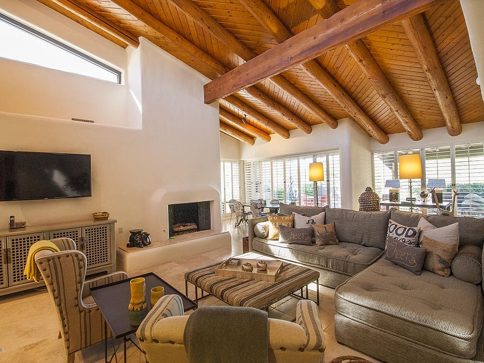 COMPLETELY REMODELED home on a private cul-de-sac lot w/extensive landscaping & private gated courtyard, located within a 1 minute walk to The Boulders Club. This charming, southwest home emanates warmth & character with dramatic Vega beams w/tongue & Groove ceilings & 24” chiseled-edge travertine floors. The gourmet kitchen features granite counters, oversized island with ample seating & Adobe style gas fireplace. Very spacious master suite with gas fireplace, private patio & large walk-in closet. Den/office with gas fireplace off the MB can be used as a 3rd bedroom. The great room, with gas fireplace, opens to a very private Flagstone patio with gas fireplace, built-in BBQ, water feature, cozy fire pit & views of the golf course. Furnishings available on separate bill of sale.