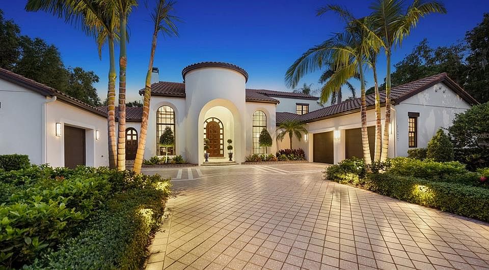 Grand and glorious executive residence with extraordinary details and a simply stunning 6,262 square foot floor plan of luxurious open living. A truly magical experience awaits with eye-catching amenities and magnificent finishes and fixtures that are second to none. Constructed in 2008 by Anchor Home Builders and remodeled in 2019, this 5 ensuite home exudes an air of comfortable elegance and draws you in to explore every nuance from its curved portico entrance with arched entry and gorgeous rounded-top door wrapped in sidelights to the lavish foyer with inlaid flooring and see-thru views to the beautiful outdoor area. The 2-story grand salon greets you with a regal ambiance with its triple set of French doors opening to the pool, lengthy clerestory windows for wonderful natural light, and a fireplace with built-ins on both sides. The divine island kitchen with 12’ ceiling goes above and beyond with top-of-the-line SubZero, Wolf and Bosch appliances and has double-thick granite counters, custom solid wood cabinetry, 2 dishwashers, 6-burner stove with griddle, 48” French door refrigerator, travertine floor, walk-in pantry, built-in desk, breakfast café, butler’s pantry with full wet bar, and even a walk-in wine cellar! The formal dining room has an exquisite 14’ cove ceiling with LED lighting and a 12’ ceiling in the family living room showcases the built-in custom solid wood entertainment center with under-shelf lighting. The secluded primary ensuite encompasses one entire side of the home and includes an office/study with custom cabinetry and LED lighting, 2 desks, and under-counter refrigerator. The primary bedroom features a custom-built bed wall, electronic blackout draperies, triple window alcove for fabulous views, and private door to the lanai and lovely backyard. A private garden setting for the primary bath is one of sublime privacy and pure indulgence with 2 walk-in closets, Jacuzzi tub, multi-head rain shower with sliding doors to the outdoor shower, and 2 custom wood vanities with mother of pearl counters. Also on the first living level are 2 additional ensuites. Adjacent to the pool path is a bonus room located off the outdoor living area. The second floor is highlighted with features like a 4th ensuite, an exercise room (5th bedroom) with sliding door access to the balcony, a billiard room with 4-seat bar with granite counters and SubZero refrigerator with ice maker. Also on this level is an oversized movie theater with built-in surround sound and updated Sony projector. You’ll love the heated saltwater pool and Jacuzzi with PebbleTec, paver decking, pool and updated multi-color LED lights. An outdoor kitchen comes equipped with a gas fireplace, gas grill, refrigerator, TV mount, and 2 Phantom screens with remote control operation. The backyard is fenced for the ultimate in privacy and has mature lush plantings. Additional highlights include a 3-car garage, generator, 3 HVAC units, new wood floors, smart home system, solid core interior doors, laundry with utility sink and storage, powder bath with stone bowl sink, and cypress ceilings on 2nd floor balcony, 1st floor outdoor living, and lanai. Fabulous location just off Orange Ave and across the street from Harbor Acres. Top ranked school system and near all of Sarasota’s sensational pleasures. One of the most spectacular examples of intelligent architecture, artful interior design and quality construction you’ll find. Even the most discerning buyer will be impressed.