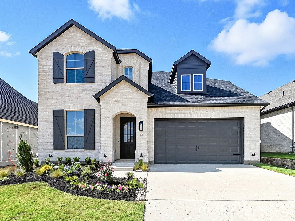 Beautiful floorplan with a loft, study, entertainment room up & brick fireplace to ceiling. This home features soaring ceilings w- 8' doors throughout & an extended outdoor covered patio. Primary suite has a bay window & luxurious separate shower w- dropped tile shower pan and drop-in tub. Kitchen has many upgrades including upgraded island, additional cabinets, double ovens, & trash can pullout. Wheaton Brick -Right Swing.