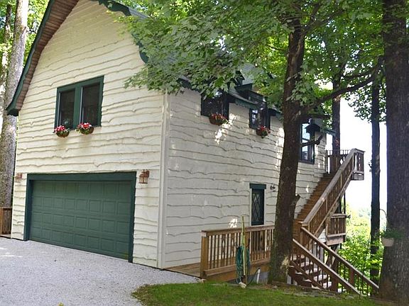 ALPINE CARRIAGE HOUSE sits on 3 LOTS on TOP OF STRAWBERRY RIDGE. A Charmer, custom built and like living in a TREE HOUSE! Native Hemlock Siding adds to the charm and true Mountain Character.The first floor of the home is a Huge 2 Car Garage with insulated door and plenty of room for storage.Studio/Bedroom with a private entrance and deck, Half Bath and Laundry convenient on this floor for your guest privacy. Upper Level sits among the trees opening to a great SOUTHERN & WESTERN VIEW. Living Great Room is open with frame ceiling where the comfort of wood surrounds you. Kitchen equipped with gas cook-top, elect. convection oven, dishwasher, custom cabinetry & pantry. Wood burning unique stone fireplace. Master is Huge with 2 closets and custom Full Bath. MUST SEE PERFECTION IN THE SKY!