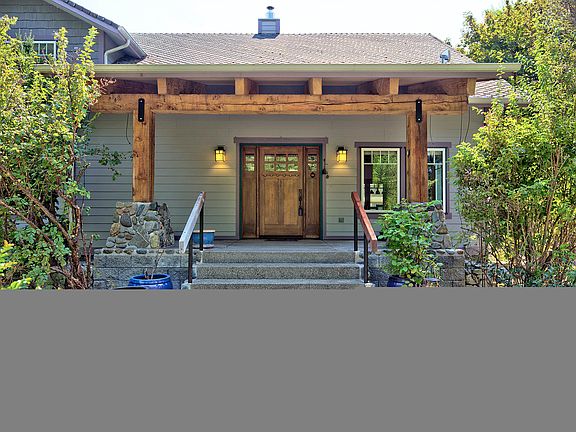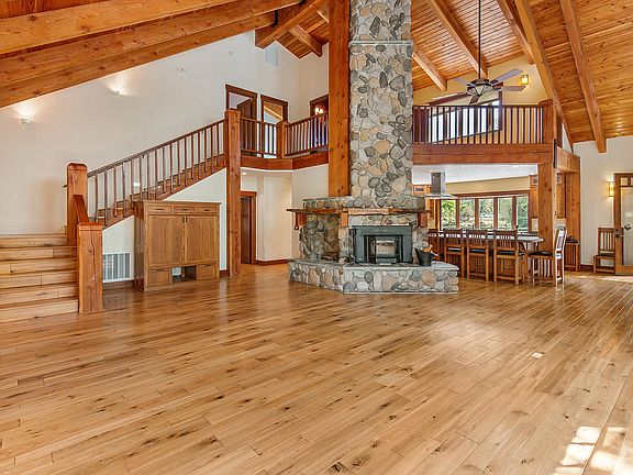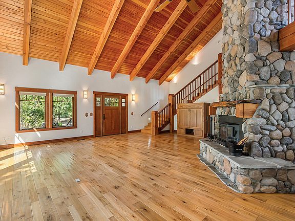 Jaw Dropping 2 story wonder on Williams Creek. 3 Bedroom, 2 1/2 bath open floor plan 2914 sf with ceiling height to heaven. The massive interior log pillars and wood stair case gives the home a sturdy rock-solid feel. Additional features are White Oak Laminate Floors throughout,, Doug Fir Ceilings & Beams, Myrtle Wood fireplace mantel, enclosed attached sun-room and open office upstairs. Solar panels are a cost-saving of hundreds of dollars yearly. The home is hugged by wonderful mature trees, shrubs & flowering plants. Williams Creek runs yearly along the full West side of the property and is accessable down a short path to a wonderful open area. The 1116 sf garage has an unfinished 450 sf attic for assundry usage. The composition roof material is extra thick and finest quality. There is a detached carport for multi-purpose use. Come spend a while in this quality built home on this delightful property.