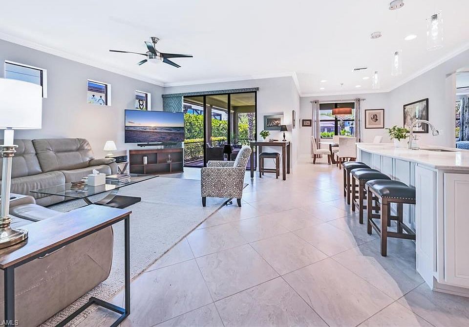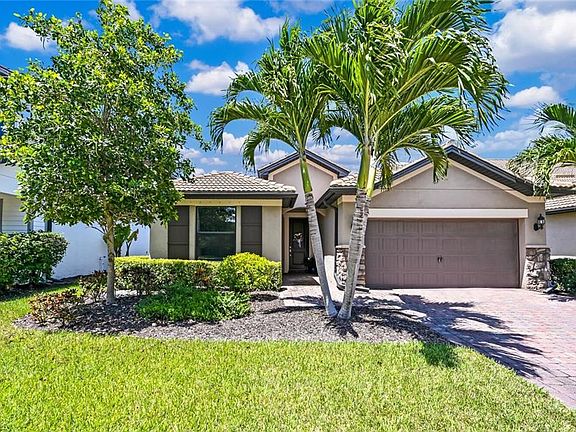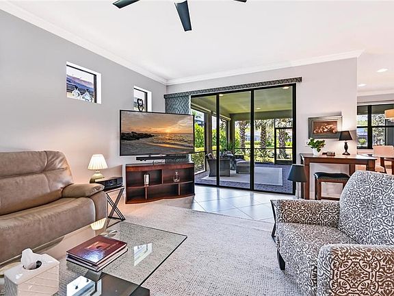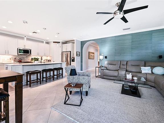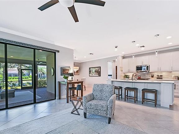 BEAUTIFULLY-APPOINTED 3-bedroom, 2-bath single family home with STUNNING VIEW OF LAKE. Nestled in the quiet, low-density Verona Pointe Estates. From your first step inside the front door, you see the peaceful view of the water and surrounding lush vegetation, along with the spacious living/kitchen area which also boasts beautiful views for your tranquil living and fun entertaining. Upgrades of the home include an extended lanai, great for entertaining; and an extended storage/workshop area in the garage with durable commercial epoxy flooring. Features of this light and airy home include an open concept floor plan, tray ceilings, and eye-catching designer wall in the great room. The kitchen offers quartz counters, a sprawling island, stainless steel appliances, Natural gas range and a professionally installed custom pantry. The master suite is tucked away from guest rooms for optimal privacy and has a huge walk-in shower and dual sinks. Verona Pointe Estates is ideally located in the heart of North Naples, with popular nearby dining and shopping options, and the beautiful Gulf beaches only a short drive away.