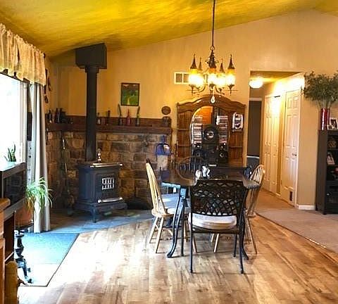 Beautiful secluded ranch on 3.97 acres, with 3 bedroom, 2 full baths. The open area of the kitchen/living room features cathedral ceilings and a wood burner that can heat the whole house saving on heating bills. Dining room features a sliding glass door with views of the wildlife and wetlands for the nature lover. The master bedroom features a master bath with jetted tub and shower. The partially finished basement includes another room that could be used as the fourth bedroom. The outdoor area features a covered picnic area for your enjoyment, very quiet location with the sounds of nature. Home Warranty included.