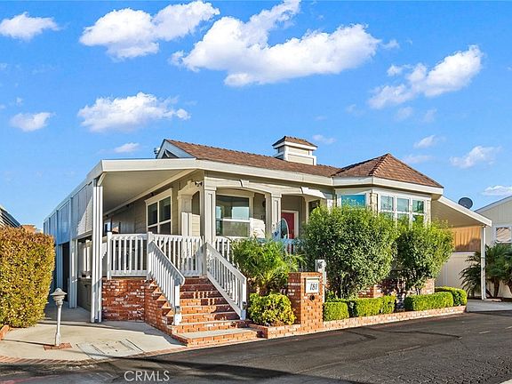 This is an incredible opportunity to own a newer home with excellent square footage on a premier lot location with no neighbor directly adjacent on one side. Rancho Del Rey Mobile Home Estates is a guard gated 55+ community located walking distance to the Huntington Harbor with a Very affordable land lease rate. Truly turnkey, this property features a tandem covered parking area suitable for two vehicles, turf and concrete patio side and rear yard, a large storage shed, air conditioning and wrap-around porch made of durable trex material. Upon entry, you are greeted into the open floor plan with plenty of natural daylight, tall ceiling heights, molding treatments and recessed lighting. The spacious kitchen features rich wood cabinetry, wood grain solid surface flooring, stainless steel appliances, a large center island with bar top seating and stone countertops. The kitchen flows seamlessly to the family room with a warm fireplace and the casual eating area that sits pleasantly in a bay window configuration. A full inside laundry room is conveniently located off of the kitchen. The deluxe primary bedroom with a walk-in closet, has a private primary bathroom with a luxurious low step glass enclosed shower, his and hers vanity area and two windows for excellent ventilation. Two generously sized guest bedrooms share a second full bathroom with a soaking tub. The Park Amenities include: 2 clubhouses, pools, saunas, card room, putting green and security guard entrance gate.