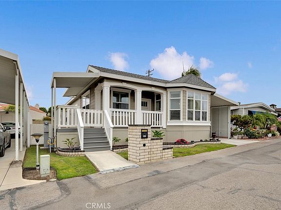This 55+ community home really delivers, situated in the highly desirable Rancho del Rey Mobile Home Estates. Convenient to sandy beaches, wetland hiking trails, shopping, restaurants, freeways and much more. Community features include gated entry with fulltime security guard, two clubhouses each with heated pools, Jacuzzi spas, sauna, banquet facilities, billiard tables, outside barbeque areas. Interior home features include open floorplan, Spacious kitchen with lots of storage cabinets, stainless appliances, large kitchen island with sink. Other interior features include plantation shutters throughout, spacious master bedroom with walk-in closet, the master bath offers dual sinks with walk-in shower and makeup vanity. Other interior features include forced air heating, ceiling fans in all bedrooms, dual pane windows, separate inside laundry room, recessed lighting and stylish panel interior doors. Exterior features include superior curb appeal, large lot with a side yard that has potential for additional patio addition. Other exterior features include nicely appointed brick hardscape work with colorful landscaping, a relaxing covered front porch, storage shed and covered carport. This Park is one of Huntington Beach's premier Parks that offers not only unsurpassed privacy and security but convenience and a stellar location adjacent to Huntington Harbour.