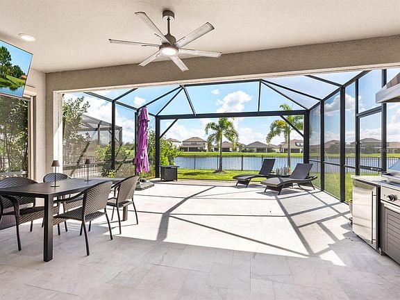 Better than new, lakefront living with a fabulous Florida resort lifestyle! Lightly lived in and beautifully upgraded, this four-bedroom plus office, three-bath home offers a blend of comfort, style, and indoor-outdoor living. Ideally oriented with southern exposure, it enjoys serene lakefront views and a spacious expanded lanai featuring travertine floors, a panoramic screen, and a fully equipped outdoor kitchen, ideal for entertaining or relaxing in style. Inside, the heart of the home is the upgraded gourmet kitchen showcasing white shaker cabinetry, polished Statuario quartz countertops, stainless steel appliances and a roomy walk-in pantry. The inviting living room opens through pocketing sliding glass doors, seamlessly connecting the interior to the lanai and backyard for Florida living. Additional highlights include 8-foot interior doors, a tray ceiling in the owner’s suite and a fenced-in backyard for peace of mind. And just a block away, Park East at Azario offers an unmatched resort-style lifestyle with a refreshing pool and spa, sand volleyball and basketball courts, pet parks, playgrounds, lawn games and open sports fields. Whether you’re enjoying a relaxing afternoon or an active weekend with family and friends, this vibrant community has it all. Better than new and ready to enjoy, this home captures the essence of the Florida lifestyle! Taxes include the CDD fee.