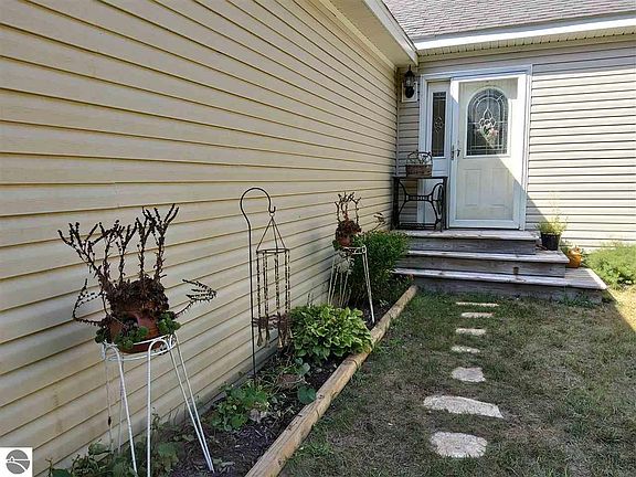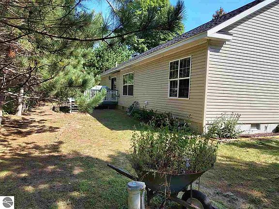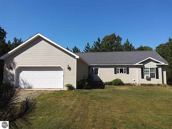 5 acres of northern Michigan style living, Charming home Large private master bed & bath with double sink vanity, soak tub, shower and walk in closet gives privacy as two other bedrooms are on opposite end of the home. A welcoming walk through Oak kitchen with pantry and modern stainless steel appliances. Island work area and a bar nook that opens up to large living/dining room. Enjoy private back yard deck and flower gardens. Large two car garage with room for storage. Home includes a pellet stove for supplemental heating. Clean and ready to move into. This private, quiet country, well built Modular Boca has 2x6 framing that conforms to Michigan state building codes. Don't miss out on this and easy access to US 31 Highway. 2 minutes to restaurants, fishing & kayaking on platte river that offers anglers some of the finest Pacific salmon, steelhead, trout fishing in the northern Michigan. Surrounded by many lakes and snowmobile trails. 8 mins to Honor Family Market & 10 mins to Interlochen Tom's Grocery, 16 minutes to major home improvement store, 19 minutes to Crystal Mountain, 20 mins to Lake Michigan, 23 minutes to Grand Traverse Mall and 28 minutes to Cherry Capital Airport.
