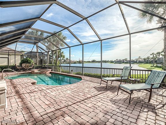 Enjoy a direct lake view with the Crown Colony 18th fairway as the backdrop in this immaculate 3/2 home. The roof is new, and all large openings and windows have roll-down shutters, making this a fully storm protected home. The granite countertop and white cabinet kitchen is open to the family room making this a wonderful entertainment home. The covered lanai area, the large paver stone deck and the heated pool with spa have a great east view over the large lake. The side-load, 2-car garage offers extra storage space and a large driveway area. Furnishings will be negotiable if desired for a quick move-in for the season. The HOA is very well run with low quarterly fees providing all lawn maintenance on a weekly schedule, 24x7 attended gated access, a community pool, hot tub, 4 Har-Tru tennis courts, and well-equipped fitness center open 24x7. Comcast fiber-optic cable and the Xfinity X1 platform with up to 4 TV/DVR boxes, and high-speed Wi-Fi Internet, are all part of the dues - over a $750 quarterly value at retail. Social or golf membership at The Golf Club at Crown Colony is optional, and offering the following special through 2024. - A golf membership purchased within 30 days of closing on this home will allow a $10,000 reduction in the Club initiation fee. This Club was chosen for the 2022 LPGA $1.5M Drive-On Championship, hosting the world's top women golfers, and is also used for PGA qualifying events