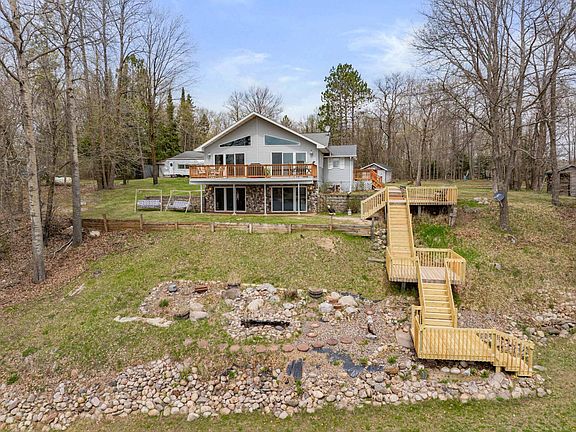 Welcome to this Swan Lake home with the convenient option to drive directly from the driveway to a level piece of 249’ of shoreline on a privately wooded lot that is 1.85 acres. The south-facing dual sets of triple patio doors flood the large living room with natural sunlight showcasing the vaulted - wood-finished ceilings and offers beautiful lake views. The additional living room space is great for entertaining large groups. This lakeside addition, basement install and main floor renovation was completed by the current owner. Other improvements include a newer furnace and decking. New Basement in 1997. The cozy lower level family room features a stunning stone gas fireplace and two more triple patio doors. Step outside to the patio and discover an abundance of outdoor living options on the many decks and shoreline area. Many outbuildings, including a heated, detached two-stall garage with two lean-tos for added storage, a single-stall garage, and two more storage buildings. This lakefront gem has been well maintained.