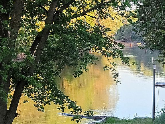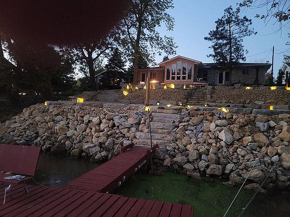 Excellent location. Beautiful executive getaway with dock (8 feet of water depth), patio, NG and wood firepits. Freshly landscaped with native stone. Exterior is Anamosa limestone (2021). Includes 2 NG fireplaces and hot tub. New Carpet, paint and granite and tile floors. All Pella and Anderson windows. Updated kitchen. Very quiet and private. Excellent Sunrises and Sunsets from the River side. Heated garage (3+ car). New Roof (2020).