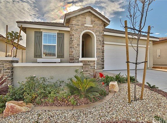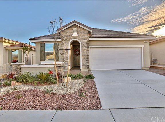 AMAZING VIEWS from this Four Seasons Home in Beaumont for 55+. Offering 5 Star Gated Resort Style living with three club houses, miles of walking trails, pools, spas, fitness center, outdoor BBQ areas, Tennis, Billiards, Sports Courts, Restaurant, Movie Theater and Salon. This home features beautiful Drought Resistant Landscape and Porch area. This TURN KEY home is less than a year old and includes over 50k in landscaping upgrades. Wood style flooring runs throughout the home and custom Plantation Shutters cover all windows. The Entertainer's kitchen features a large Island with granite counters, stainless steel appliances and a Chef's Pantry. The open concept design allows the kitchen to flow into the family room. Relax in the backyard under the large covered patio with stamped bronze concrete and beautifully landscaped back yard. Create memories with family and friends as you enjoy the majestic view of the San Jacinto Mountains. Washer, Dryer and Refrigerator are included.